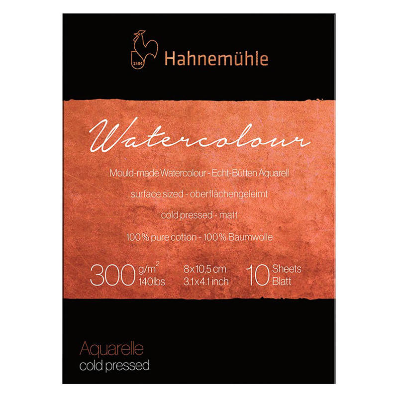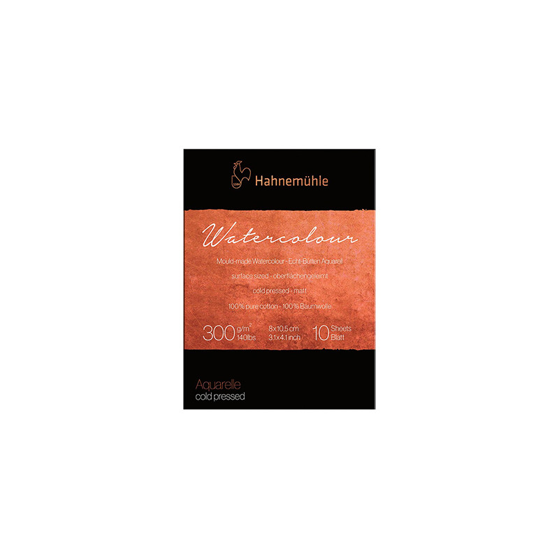 The Collection Watercolour 300 – blok do farb akwarelowych marki Hahnemühle. 10 arkuszy w rozmiarze 8 x 10.5 cm, gramatura 300 g/m². Cold Pressed (drobne ziarno).