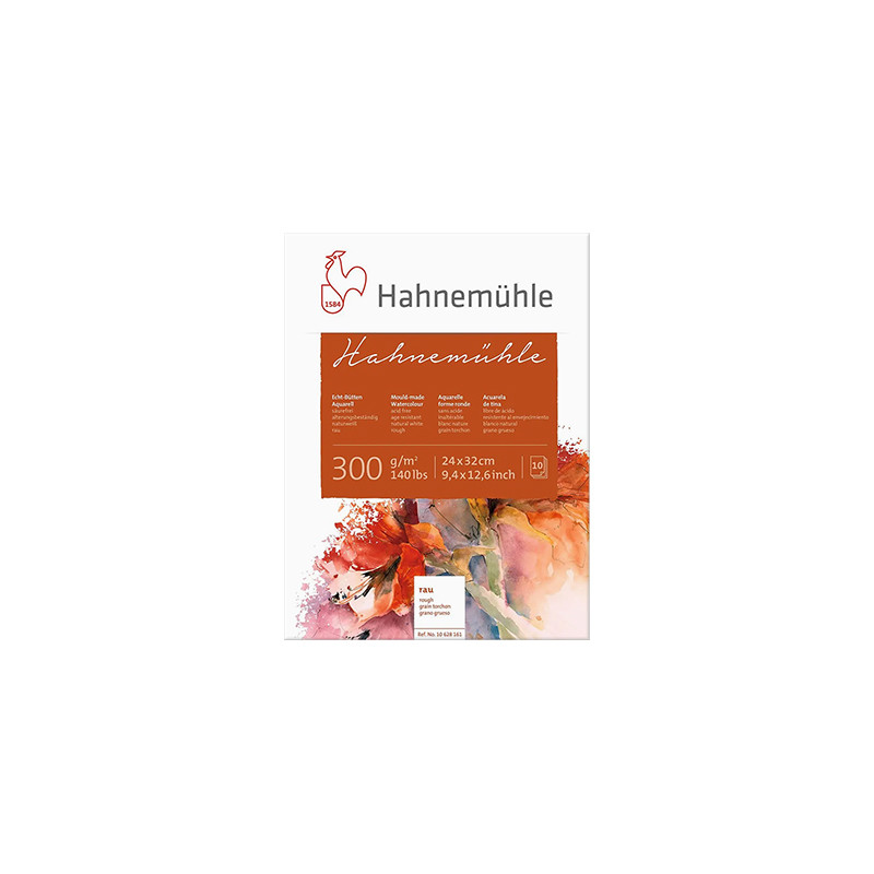 Blok papieru marki Hahnemühle, przeznaczony do farb akwarelowych i wodnych. 20 naturalnie białych arkuszy o gruboziarnistej powierzchni Rough, w rozmiarze 24 x 32 cm. Papier jest bezkwasowy i odporny na starzenie. Dzięki swojej gramaturze przyjmuje spore ilości wody bez nadmiernego falowania się. Artystyczny blok przeznaczony jest do farb akwarelowych, gwaszy, temper i akrylu. Tylna okładka bloku to gruba, sztywna tektura. Arkusze klejone po 4 bokach.