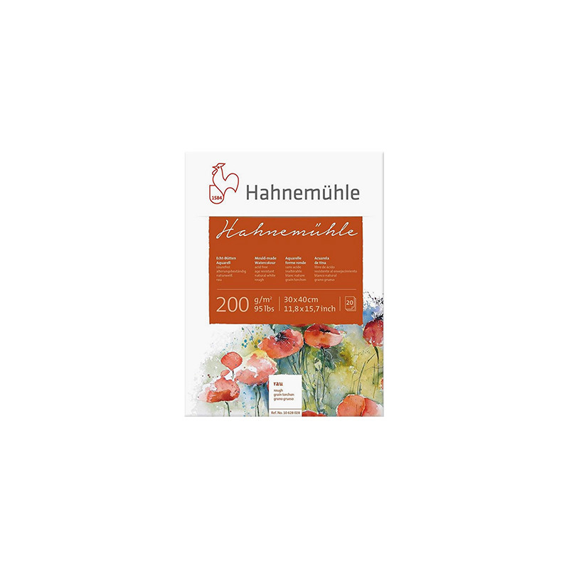 Blok papieru marki Hahnemühle, przeznaczony do farb akwarelowych i wodnych. 20 naturalnie białych arkuszy o gruboziarnistej powierzchni rough, w rozmiarze 30 x 40 cm. Papier jest bezkwasowy i odporny na starzenie. Dzięki swojej gramaturze przyjmuje spore ilości wody bez nadmiernego falowania się. Artystyczny blok przeznaczony jest do farb akwarelowych, gwaszy, temper i akrylu. Tylna okładka bloku to gruba, sztywna tektura. Arkusze klejone po 4 bokach.