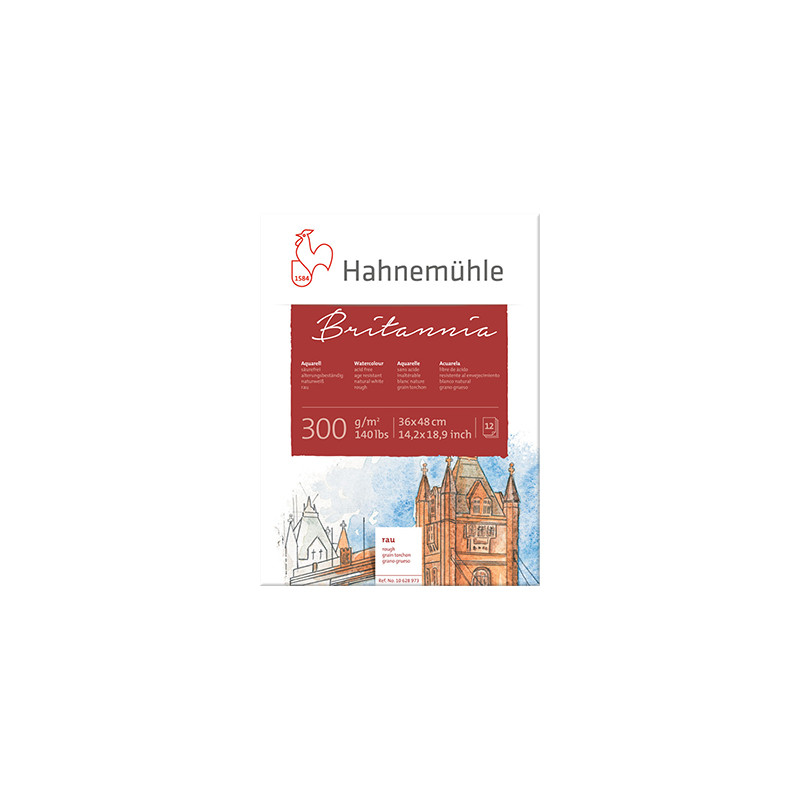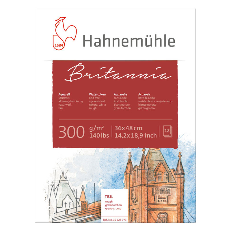 Blok do farb akwarelowych Britannia marki Hahnemühle. 12 białych gruboziarnistych arkuszy typu Rough w rozmiarze 36 x 48 cm. Gramatura: 300 g/m2. Więcej szczegółów
