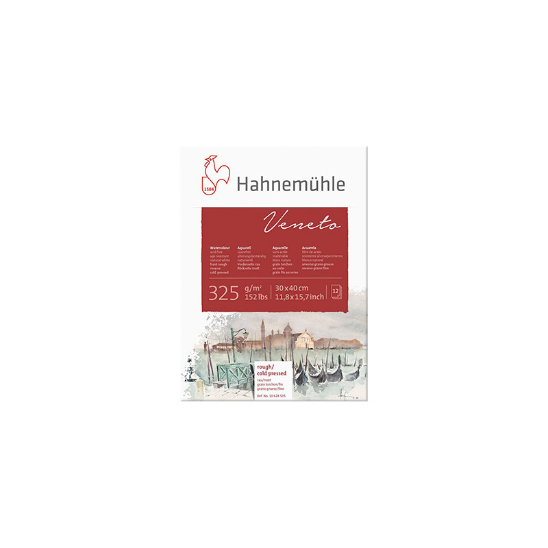 Blok papieru do farb akwarelowych serii Veneto marki Hahnemuhle. 12 arkuszy w formacie 30 x 40 cm, gramatura 325 g/m². Papier dwustronny Cold Pressed / Rough. Więcej szczegółów