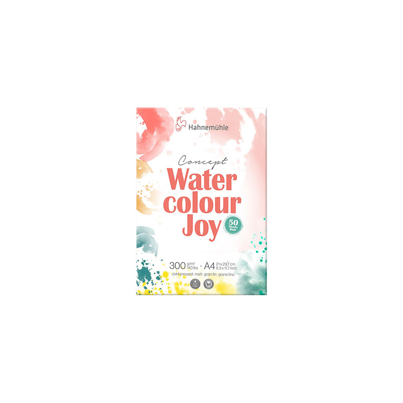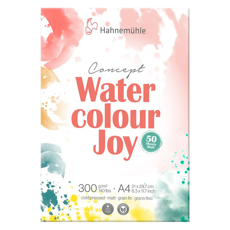 Blok do akwareli i mokrych technik Concept Water colour Joy marki Hahnemuhle. Bezkwasowe arkusze papieru w kolorze naturalnej bieli posiadają drobnoziarnistą fakturę typu cold pressed. Gramatura papieru wynosi 300 g/m² co pozwala malować dużą ilością wody. Papier wykonano w 100% z włókien celulozowych. Dzięki powierzchniowemu klejeniu doskonale chłonie farbę i pozwala na komfortową pracę z różnymi mediami: akwarelą, gwaszem, akrylem, tuszem, cienkopisami oraz kredkami akwarelowymi. Jak wszystkie papiery marki Hahnemühle, Concept Watercolour Joy jest bezkwasowy, odporny na starzenie i wegański, co gwarantuje trwałość prac na lata.