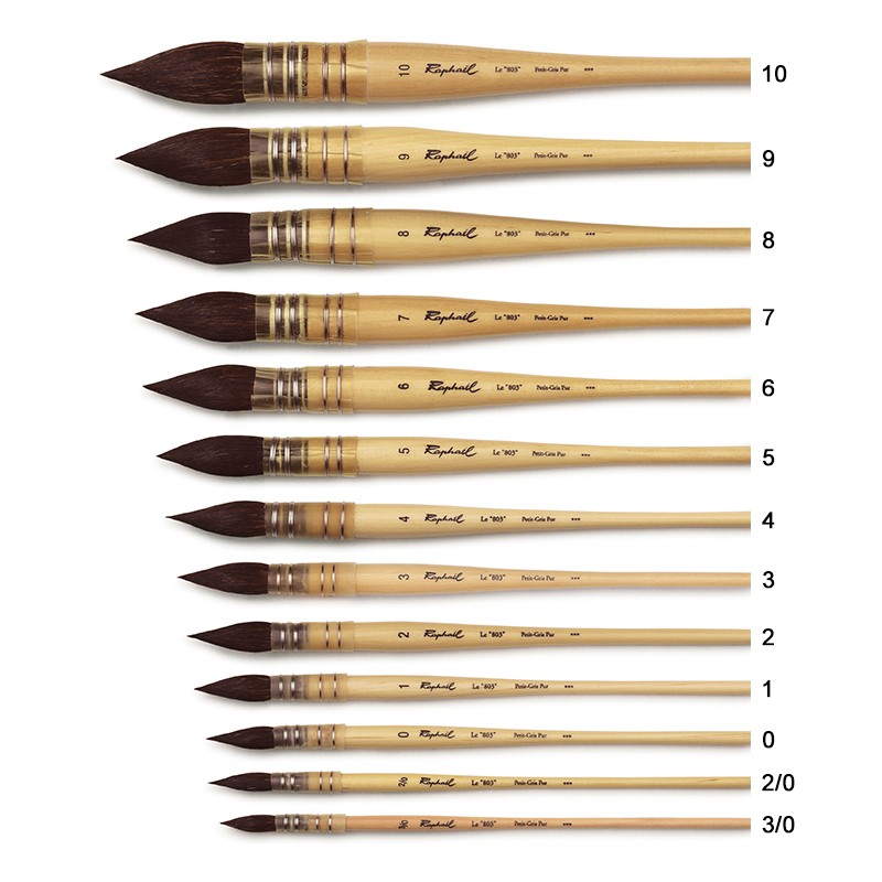 Pędzel serii 803 marki Raphael z naturalnego włosia wiewiórki. Okrągły pędzel typu MOP odznaczający się bardzo dużą retencją, przeznaczony do farb akwarelowych. Więcej szczegółów