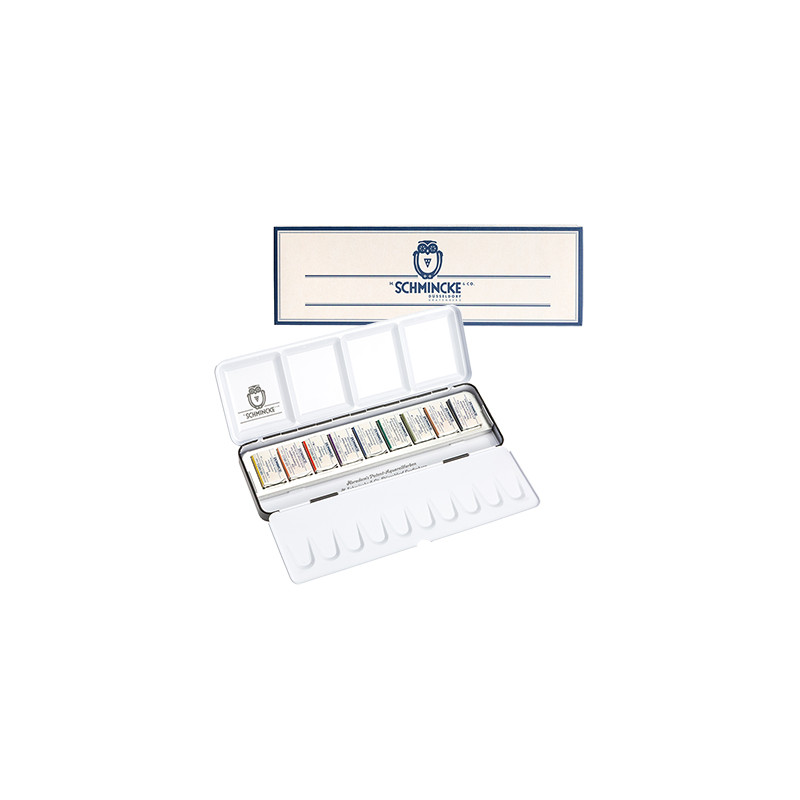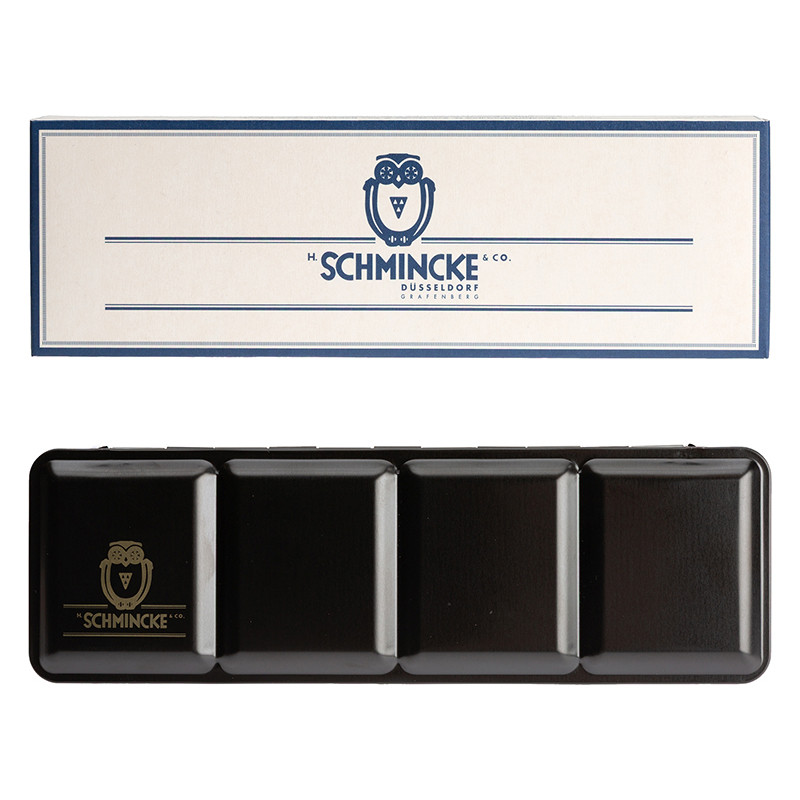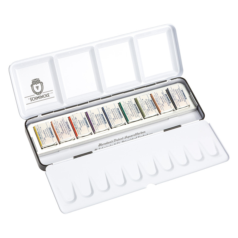 Technical Colours – komplet profesjonalnych farb akwarelowych Horadam Schmincke, 9 kostek (full pan). Metalowa kasetka z paletą do mieszania kolorów. Więcej szczegółów