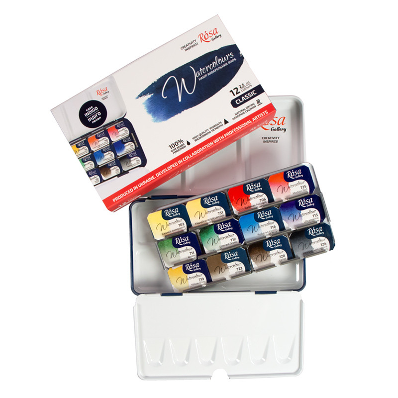 Zestaw farb akwarelowych Rosa Gallery. 12 pełnych kostek w podstawowej gamie barw. Wysokiej jakości spoiwo, pigmenty i światłoodporność. Metalowe etui. Więcej szczegółów