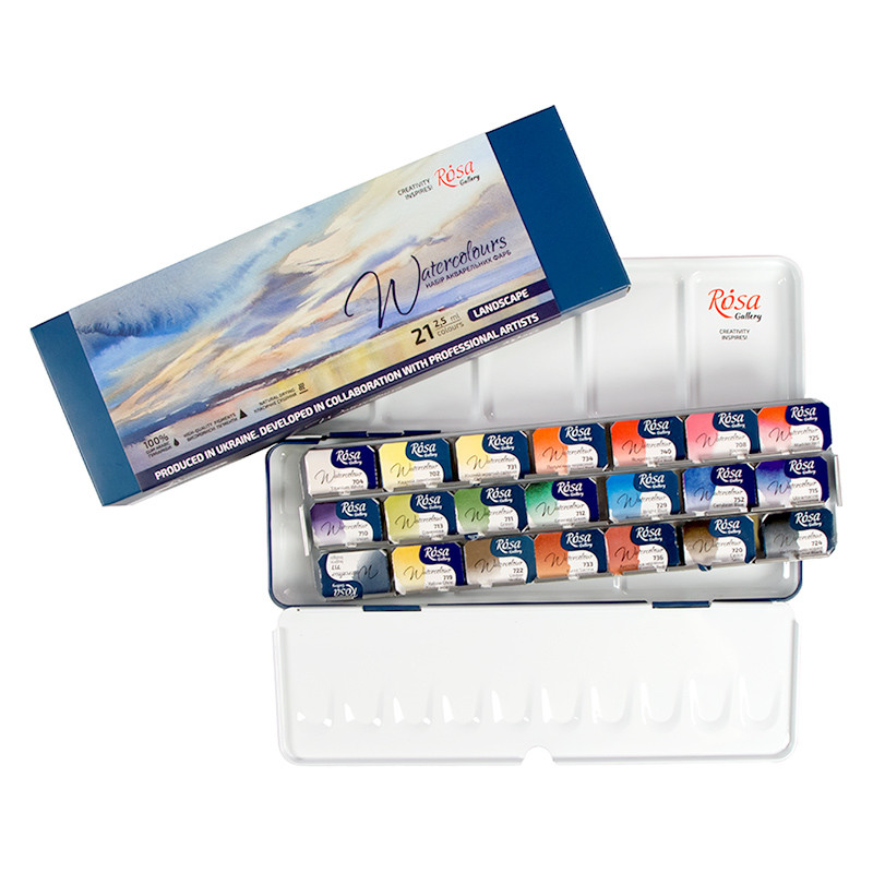 Zestaw farb akwarelowych Landscape Rosa Gallery. 21 pełnych kostek w metalowym etui. Wysokiej jakości spoiwo, pigmenty i światłoodporność. Więcej szczegółów