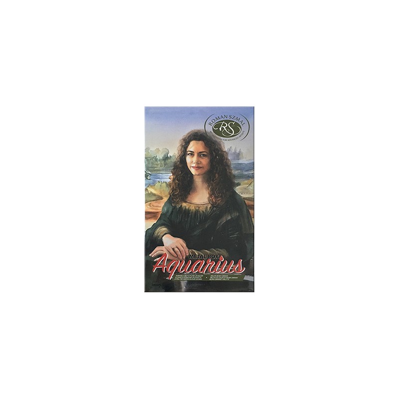Aquarius Watercolors – najwyższej jakości wilgotne farby akwarelowe, produkowane w Polsce przez markę Roman Szmal. Pełna gama kolorów obejmuje aż 140 pozycji! Większość barw opiera się na jednym pigmencie – dzięki temu uzyskamy oczekiwane kolory podczas ich mieszania. Spoiwem farb jest guma arabska i miód pszczeli. Duże kostki (full pan) charakteryzują się wysoką wydajnością oraz intensywnością kolorów. Wszystkie kolory posiadają najwyższa klasę światłoodporności według skali Blue Wool. Zestaw farb umieszczono w metalowej kasecie przytrzymującej kostki - wieko może posłużyć jako paleta do mieszania kolorów.