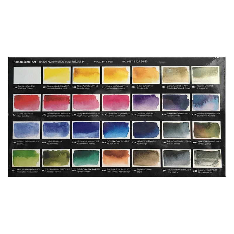 Farba akwarelowa Aquarius Roman Szmal. Komplet 28 kolorów, paleta: Mona Omrani. Metalowa kasetka.