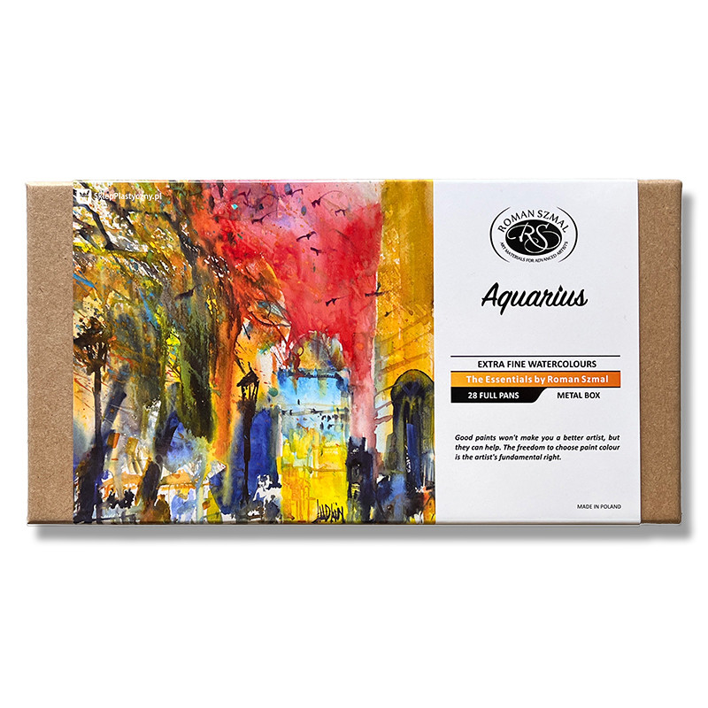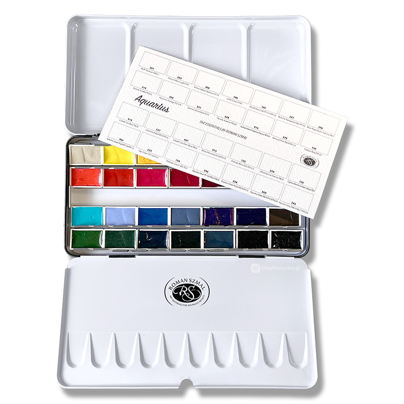 Komplet farb akwarelowych Aquarius The Essentials by Roman Szmal, 28 kolorów. Najwyższej jakości akwarele w kostce (full pan). Baza: guma arabska i miód. Więcej szczegółów