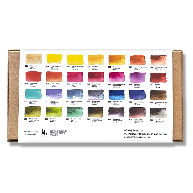 Paleta kolorów obejmuje niezbędne podstawowe barwy wyselekcjonowane przez samego producenta Romana Szmala. Na okładce akwarela autora K. Ludwin.