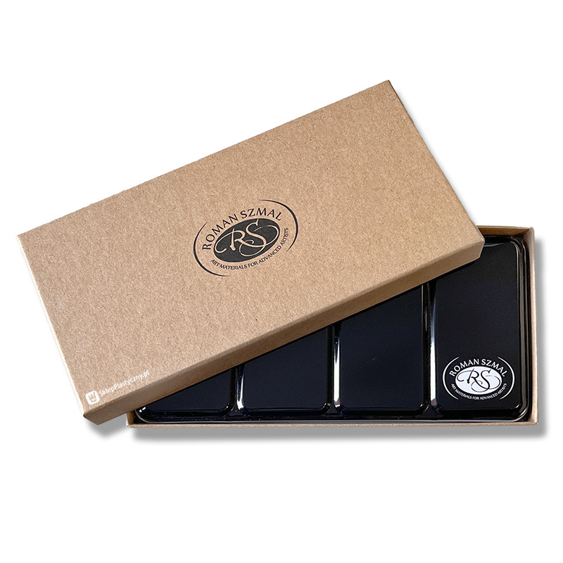 Zestaw farb umieszczono w profesjonalnej metalowej kasecie z paletą (dodatkowo wieko kasety może posłużyć jako druga paleta do mieszania kolorów).