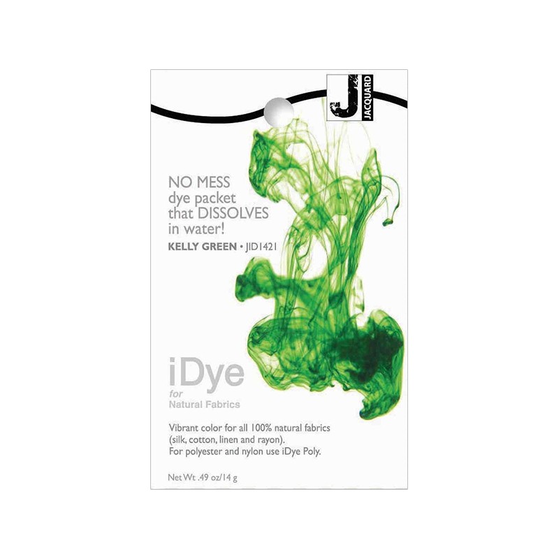 421 Kelly Green iDye Jacquard – barwnik do tkanin naturalnych takich jak len, płótno, bawełna, jedwab itp. 14 g barwnego proszku w wodorozpuszczalnej saszetce.