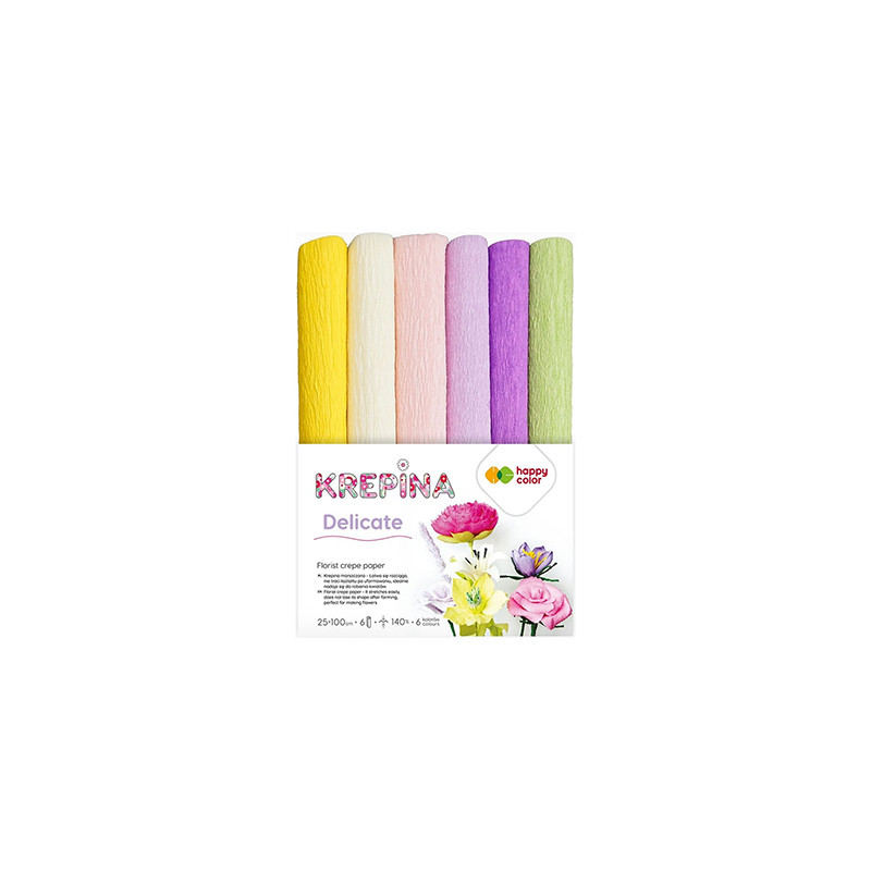 Zestaw zawiera 6 kolorów DELICATE - każdy rulonik to zwinięty arkusz w rozmiarze 25 x 100 cm. Krepina jest idealna do scrapbookingu, tworzenia ozdób, a także do pakowania prezentów i dekorowania przesyłek. Może być używana do tworzenia lampionów i witraży.