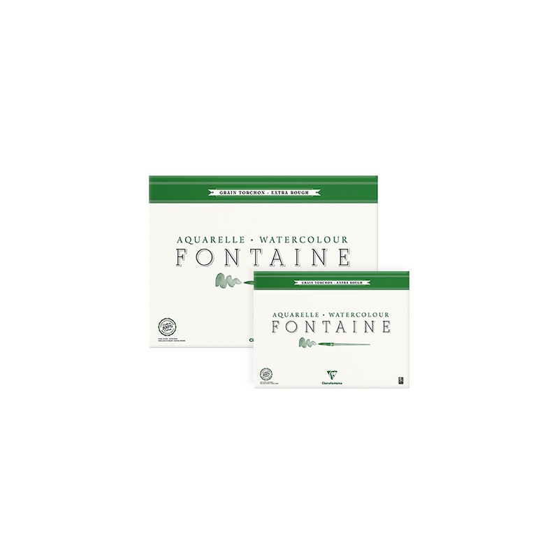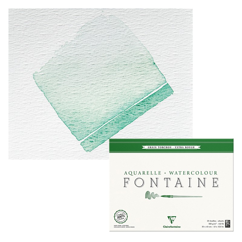 Profesjonalny papier Fontaine marki Clairefontaine do malarstwa akwarelowego. Artystyczny papier do akwareli charakteryzuje się regularną strukturą włókien najwyższej jakości oraz znakomitą ekspozycją kolorów. Faktura papieru extra-rough to gruboziarnista powierzchnia o mocno widocznych nierównościach. Blok klejony po 4 bokach. Zawiera 25 arkuszy w kolorze naturalnej bieli. Papier jest bezkwasowy, pozbawiony wybielaczy optycznych, a jego wysoka gramatura 300 g/m² odznacza się doskonałą absorpcją.