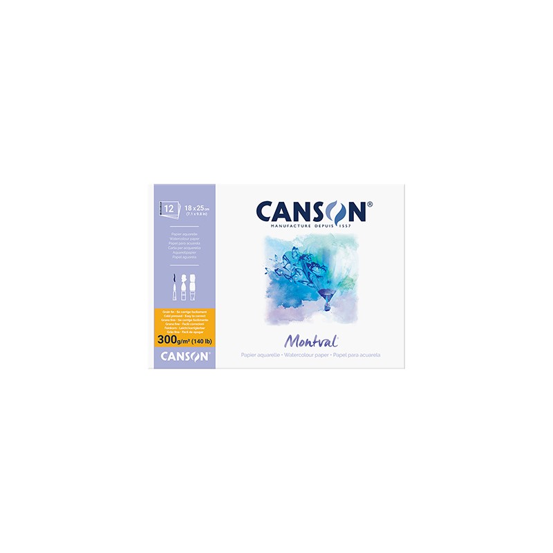 Blok akwarelowy Canson Montval, klejony na krótkim boku. 12 arkuszy drobnoziarnistego papieru w formacie 18x25cm i gramaturze 300 g/m². Więcej szczegółów