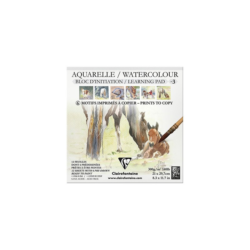Blok do farb akwarelowych francuskiej marki Clairefontaine, 12 arkuszy o gramaturze 300 g/m², format 21 cm x 21 cm.