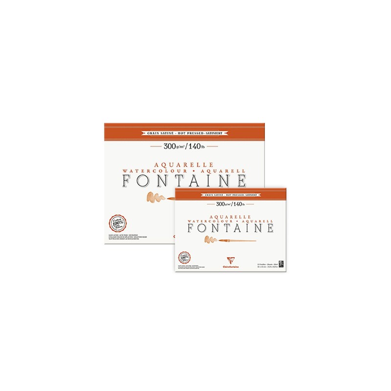 Profesjonalny papier Fontaine marki Clairefontaine do malarstwa akwarelowego. Artystyczny papier do akwareli charakteryzuje się regularną strukturą włókien najwyższej jakości oraz znakomitą ekspozycją kolorów. Faktura papieru tłoczonego na ciepło (hot pressed) to satynowa powierzchnia, po której gładko sunie pędzel, a nakładany kolor rozprowadza się równomiernie. Blok klejony po 4 bokach. Zawiera 20 arkuszy w kolorze naturalnej bieli. Papier jest bezkwasowy, pozbawiony wybielaczy optycznych, a jego wysoka gramatura 300 g/m² odznacza się doskonałą absorpcją.