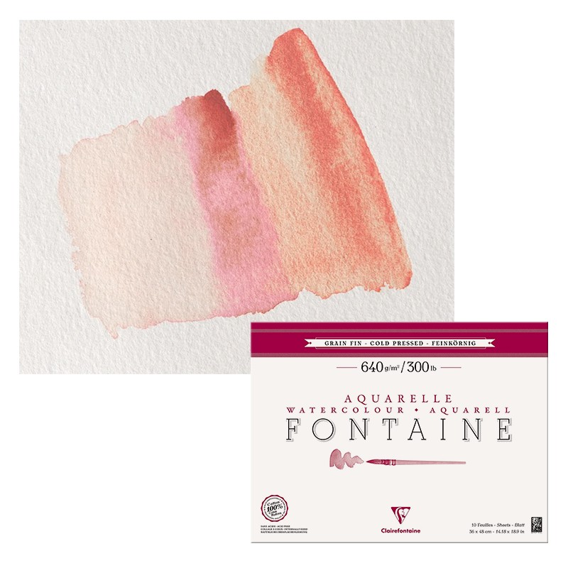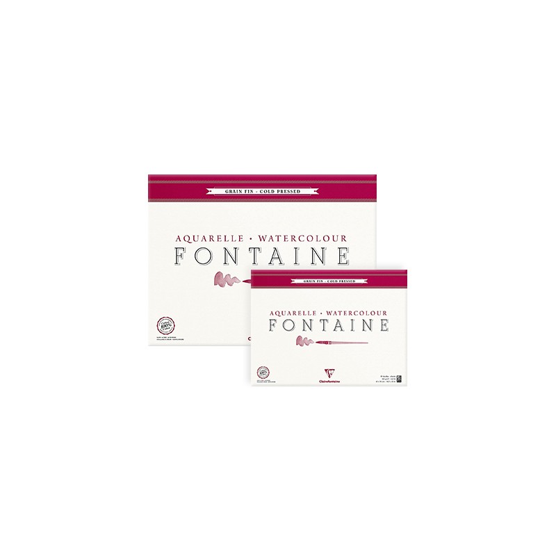 Profesjonalny papier Fontaine marki Clairefontaine do malarstwa akwarelowego. Artystyczny papier do akwareli charakteryzuje się regularną strukturą włókien najwyższej jakości oraz znakomitą ekspozycją kolorów. Faktura papieru cold pressed to drobnoziarnista powierzchnia – najczęściej wybierana przez akwarelistów. Blok klejony po 4 bokach. Zawiera 25 arkuszy w kolorze naturalnej bieli. Papier jest bezkwasowy, pozbawiony wybielaczy optycznych, a jego wysoka gramatura 300 g/m² odznacza się doskonałą absorpcją.
