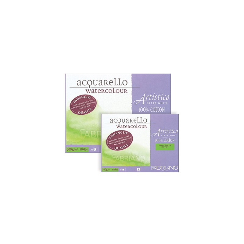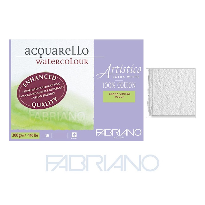 Papier akwarelowy Fabriano Artistico extra white w bloku klejonym czterostronnie, wytwarzany w cylindrycznej maszynie wyprodukowany jest w 100% z bawełny a także jest wolny od chloru, bezkwasowy i o neutralnym pH dzięki czemu jest bardzo odporny na starzenie. Doskonale nadaje się do akwareli, gwaszu, tuszu, grafitu i ołówka. Można również wykorzystywać go do prac z użyciem prasy. Papier wyprodukowany bez wybielaczy optycznych. Nie zawiera naturalnej żelatyny - vegan friendly.