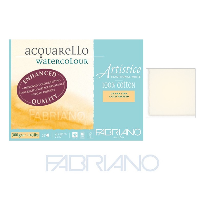 Papier akwarelowy Fabriano Artistico traditional white w bloku klejonym czterostronnie, wytwarzany w cylindrycznej maszynie wyprodukowany jest w 100% z bawełny a także jest wolny od chloru, bezkwasowy i o neutralnym pH dzięki czemu jest bardzo odporny na starzenie. Doskonale nadaje się do akwareli, gwaszu, tuszu, grafitu i ołówka. Można również wykorzystywać go do prac z użyciem prasy. Papier wyprodukowany bez wybielaczy optycznych. Nie zawiera naturalnej żelatyny - vegan friendly.