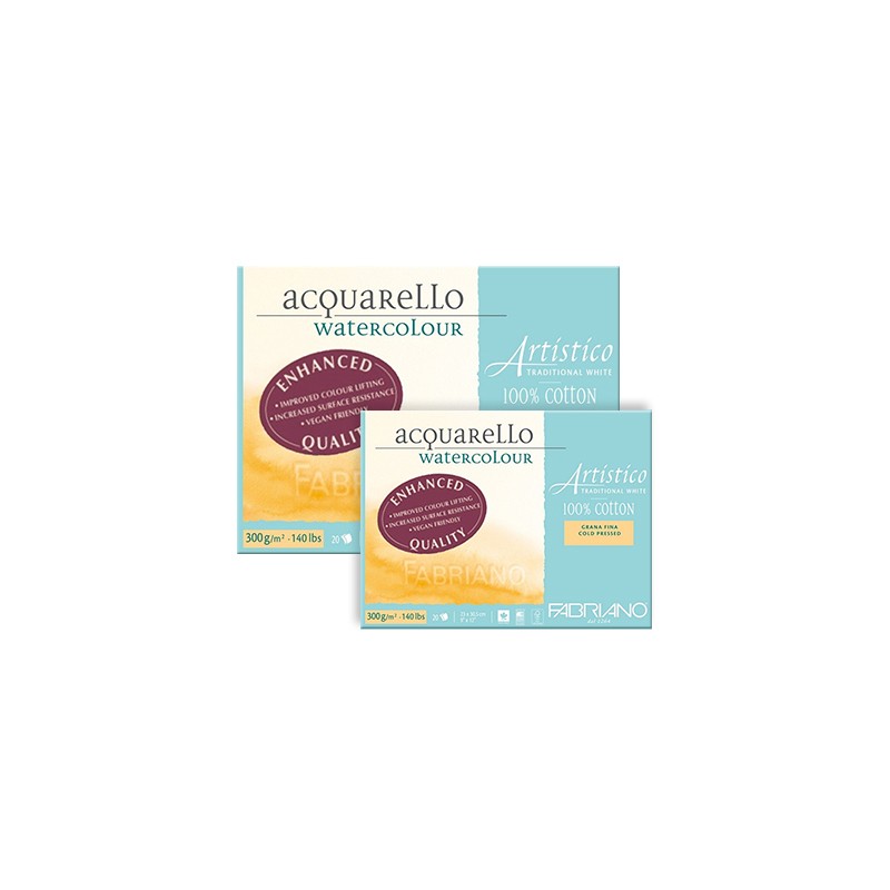 Papier akwarelowy Fabriano Artistico traditional white w bloku klejonym czterostronnie, wytwarzany w cylindrycznej maszynie wyprodukowany jest w 100% z bawełny a także jest wolny od chloru, bezkwasowy i o neutralnym pH dzięki czemu jest bardzo odporny na starzenie. Doskonale nadaje się do akwareli, gwaszu, tuszu, grafitu i ołówka. Można również wykorzystywać go do prac z użyciem prasy. Papier wyprodukowany bez wybielaczy optycznych.