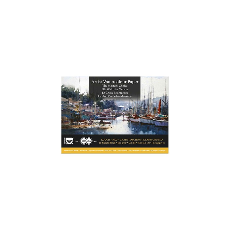 Profesjonalny blok do akwareli marki The Masters' Choice serii Baohong. Gruboziarnisty papier (rough) o gramaturze 300 g/m2 wykonany w 100% z bawełny to niezastąpione podłoże do malarstwa akwarelowego. 20 arkuszy naturalnie białego papieru powleczono żelatyną i sklejono ze sobą na 4 bokach by móc malować bezpośrednio na bloku bez konieczności naciągania papieru.