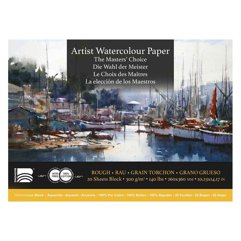 Profesjonalny blok papieru do akwareli Baohong marki The Masters' Choice. 20 gruboziarnistych arkuszy, 100% bawełny, 300 g/m2, rozmiar: 26 x 36 cm. Więcej szczegółów