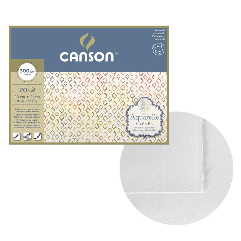 Blok malarski marki Canson przeznaczony do farb akwarelowych. Papier produkowany jest w sposób tradycyjny na cylindrycznych maszynach i zawiera 60 % włókien bawełny, dzięki czemu jest trwały i odporny na korekty w trakcie malowania. Wysoka gramatura papieru 300 g/m² pozwala pracować z dużą ilością wody bez nadmiernego falowania arkusza. Blok akwarelowy Canson Aquarelle pozbawiony jest wybielaczy optycznych co oznacza, że kolor arkuszy jest w odcieniu ciepłej bieli. Dzięki bezkwasowości i buforowaniu alkalicznemu, papier jest odporny na starzenie i zachowuje swoją doskonałą jakość przez długi czas.