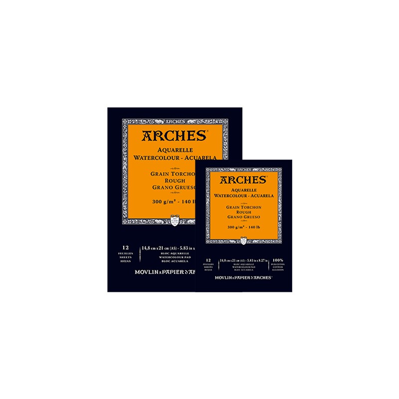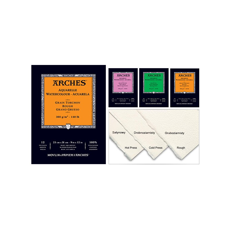 Papiery bloków Arches występują w trzech odmianach: satynowej, drobnoziarnistej i gruboziarnistej. Różnice opierają się o strukturę powierzchni arkusza, a każdy z nich dedykowany jest odmiennym zastosowaniom (portrety, pejzaże) i twórcom (profesjonalistom i amatorom).