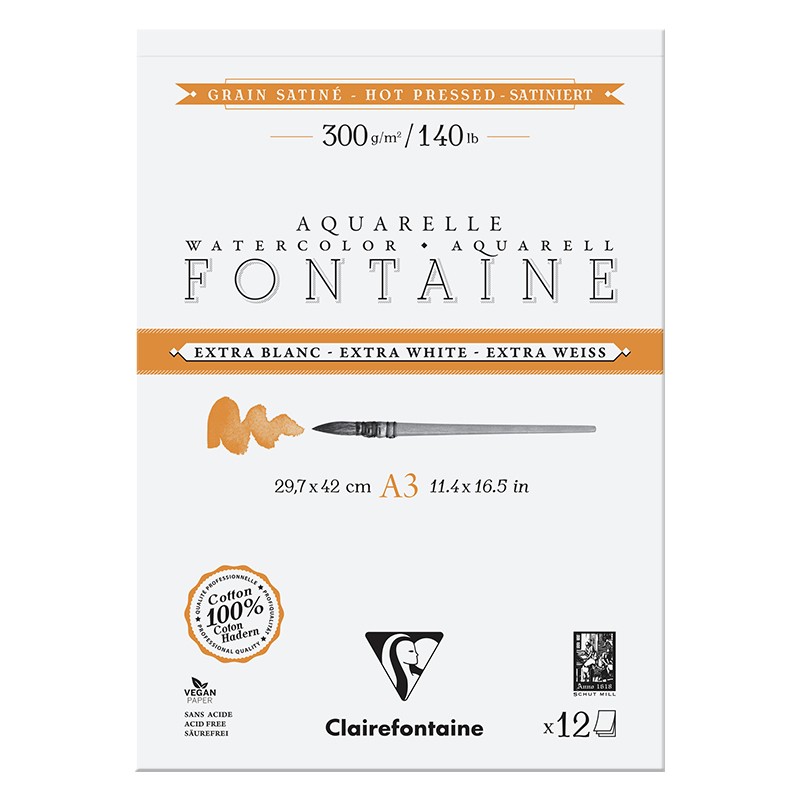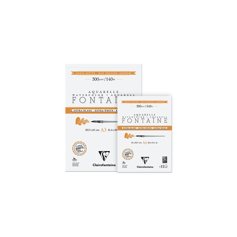 Profesjonalny papier Fontaine marki Clairefontaine do malarstwa akwarelowego. Artystyczny papier do akwareli charakteryzuje się regularną strukturą włókien najwyższej jakości oraz znakomitą ekspozycją kolorów. Faktura papieru tłoczonego na ciepło (hot pressed) to satynowa powierzchnia, po której gładko sunie pędzel, a nakładany kolor rozprowadza się równomiernie. Blok klejony po dwóch krótszych bokach. Zawiera 12 arkuszy w kolorze extra white. Papier jest bezkwasowy a jego wysoka gramatura 300 g/m² odznacza się doskonałą absorpcją.