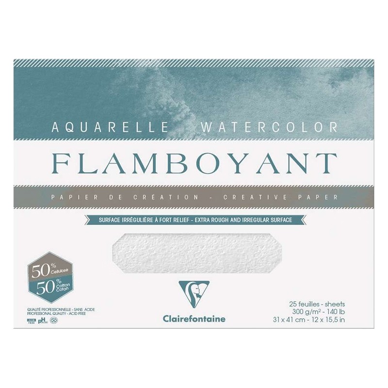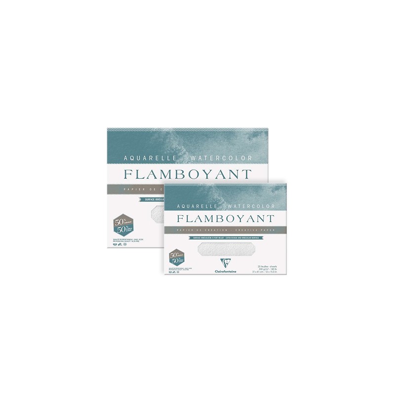 Profesjonalny blok akwarelowy marki Clairefontaine o bardzo wyraźnej, nieregularnej i gruboziarnistej fakturze (extra rough). Papier powstaje w oparciu o 50% włókien bawełnianych oraz 50% najwyższej jakości bezdrzewnych włókien celulozowych, co gwarantuje doskonałą trwałość. Papier w kolorze naturalnej bieli, sprawdzi się przede wszystkim do malowania abstrakcji lub prac, w której ziarnista struktura będzie podkreślać walor tematu. Na tym papierze odradza się stosowanie płynu maskującego. Papier produkowany jest zgodnie z holenderską tradycją wytwarzania papieru. Papier w bloku Flamboyant jest bezkwasowy, o neutralnym pH i zgodny z normą ISO 9706.
