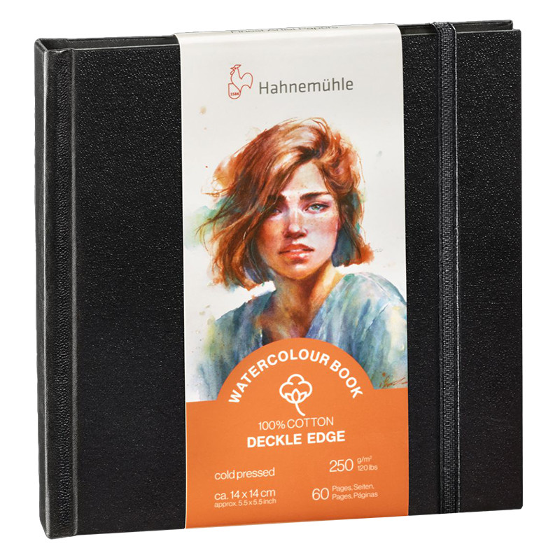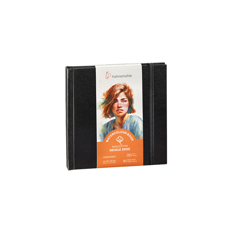 Blok akwarelowy marki Hahnemuhle w twardej oprawie, zamykany na elastyczną taśmę. 30 białych, bawełnianych arkuszy o nieregularnych krawędziach z drobnoziarnistą fakturą cold pressed. Gramatura papieru wynosi 250 g/m² co umożliwia pracę z dużą ilością wody. Arkusze są ręcznie obrywane i zszywane tworząc unikalny szkicownik o wyjątkowym charakterze. Dzięki twardej, solidnej oprawie arkusze są dobrze chronione, zwłaszcza gdy szkicownik jest często w transporcie. Rozmiar : 14 x 14 cm.