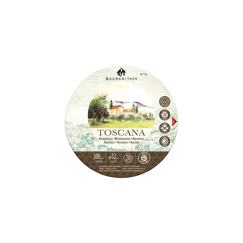 Papier Toscana Magnani 1404 przeznaczony do farb akwarelowych. 20 okrągłych arkuszy papieru akwarelowego o gruboziarnistej fakturze (rough/torchon) w kolorze naturalnej bieli. Wysokiej jakości papier wykonany w 100% z bawełny jest bezkwasowy, pozbawiony wybielaczy optycznych i zachowuje swój wygląd przez długie lata. Dzięki wysokiej gramaturze 300 g/m² papier może być stosowany do techniki "mokre na mokre". Papier wytwarzany jest tradycyjnymi metodami na cylindrycznych maszynach bębnowych. Arkusze papieru nie są klejone - producent dołączył materiałowy woreczek do ich przechowywania. Średnica bloczku wynosi 16 cm.