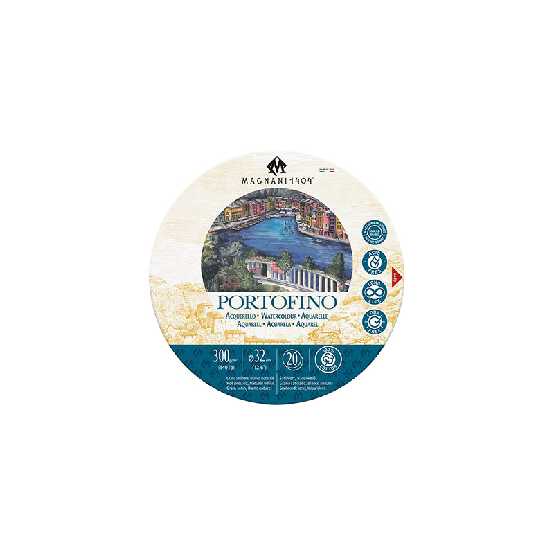 Papier Portofino Magnani 1404 przeznaczony do farb akwarelowych. 20 okrągłych arkuszy papieru akwarelowego o satynowej fakturze (hot pressed) w kolorze naturalnej bieli. Wysokiej jakości papier wykonany w 100% z bawełny jest bezkwasowy, pozbawiony wybielaczy optycznych i zachowuje swój wygląd przez długie lata. Dzięki wysokiej gramaturze 300 g/m² papier może być stosowany do techniki "mokre na mokre". Papier wytwarzany jest tradycyjnymi metodami na cylindrycznych maszynach bębnowych. Arkusze papieru nie są klejone - producent dołączył materiałowy woreczek do ich przechowywania. Średnica bloczku wynosi 16 cm.