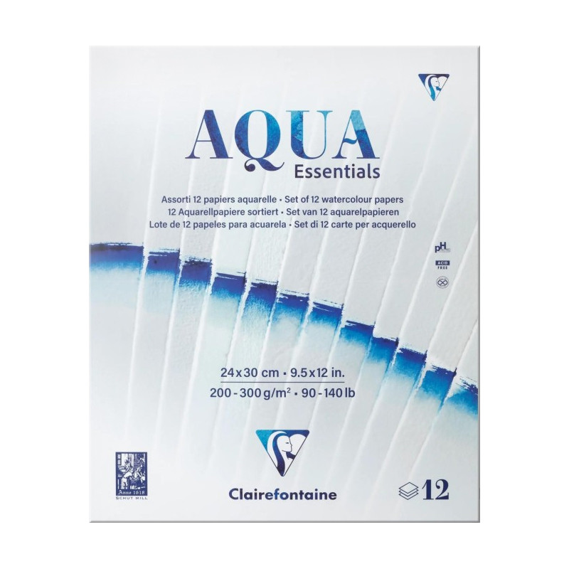 Aqua Essentials – zestaw 12 papierów akwarelowych marki Clairefontaine w rozmiarze 24 x 30 cm.
