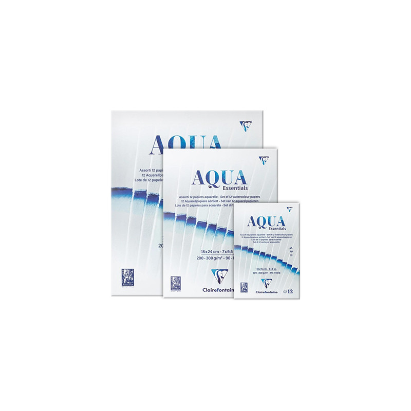 Aqua Essentials – zestaw 12 papierów akwarelowych marki Clairefontaine w rozmiarze 10 x 15 cm.