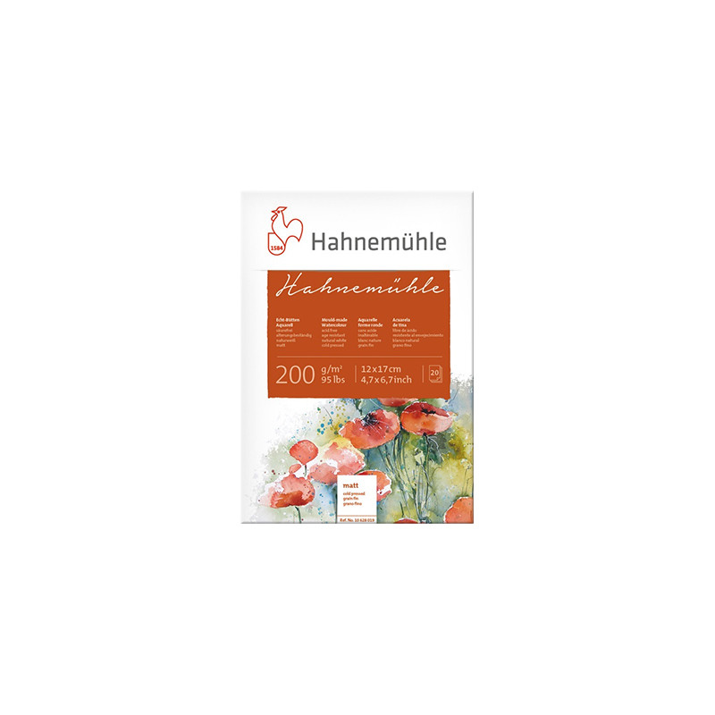 Blok papieru marki Hahnemühle, przeznaczony do farb akwarelowych i wodnych. 20 naturalnie białych arkuszy o drobnoziarnistej powierzchni, w rozmiarze 12 x 17 cm. Papier tłoczony na zimno, bezkwasowy i odporny na starzenie. Dzięki swojej gramaturze przyjmuje spore ilości wody bez nadmiernego falowania się. Artystyczny blok przeznaczony jest do farb akwarelowych, gwaszy, temper i akrylu. Tylna okładka bloku to gruba, sztywna tektura.
