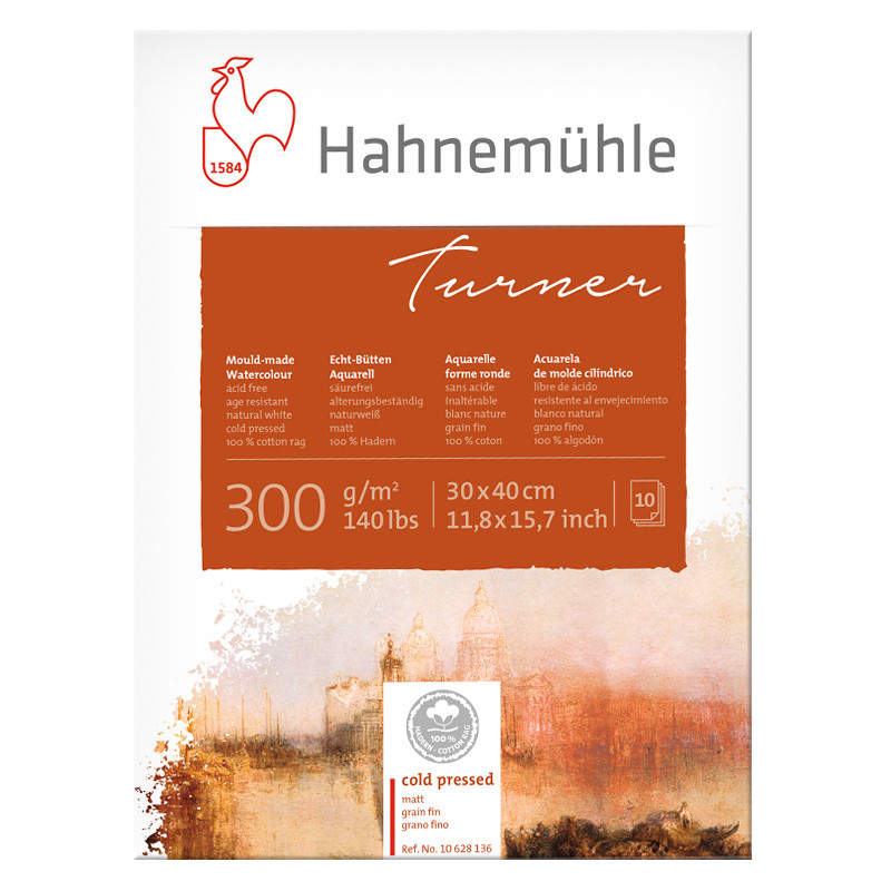 Turner 100% Cotton – blok do akwareli marki Hahnemühle. 10 naturalnie białych, drobnoziarnistych arkuszy w rozmiarze 30 x 40 cm, gramatura: 300 g/m².