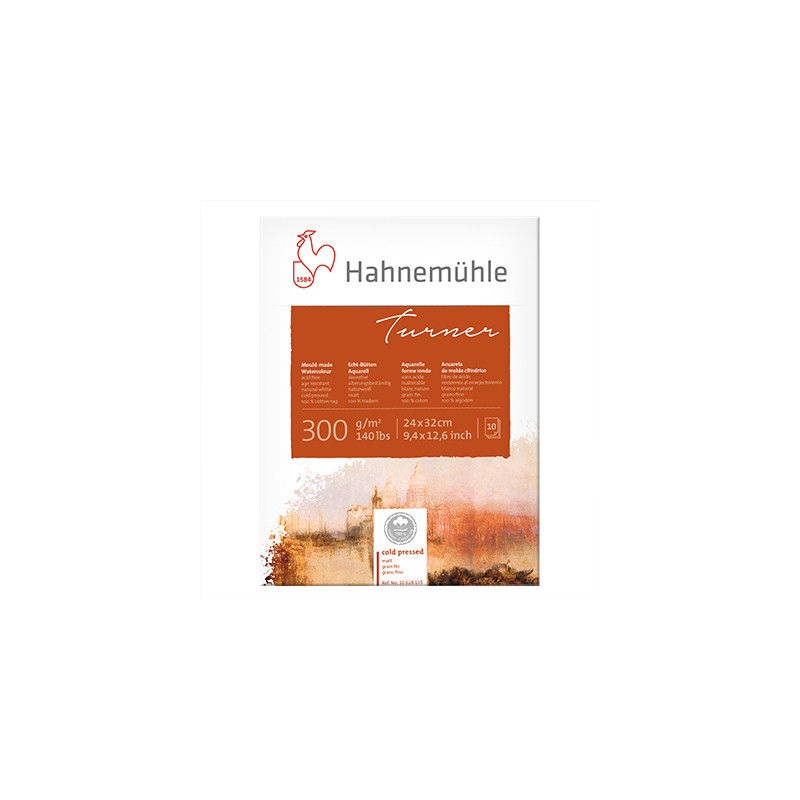 Blok z papierem bawełnianym Turner marki Hahnemühle do farb akwarelowych. 10 białych arkuszy typu cold pressed w rozmiarze 24 x 32 cm. Gramatura: 300 g/m². Więcej szczegółów