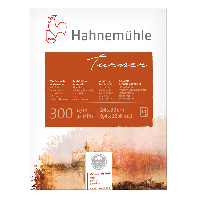 Turner 100% Cotton – blok do akwareli marki Hahnemühle. 10 naturalnie białych, drobnoziarnistych arkuszy w rozmiarze 24 x 32 cm, gramatura: 300 g/m².
