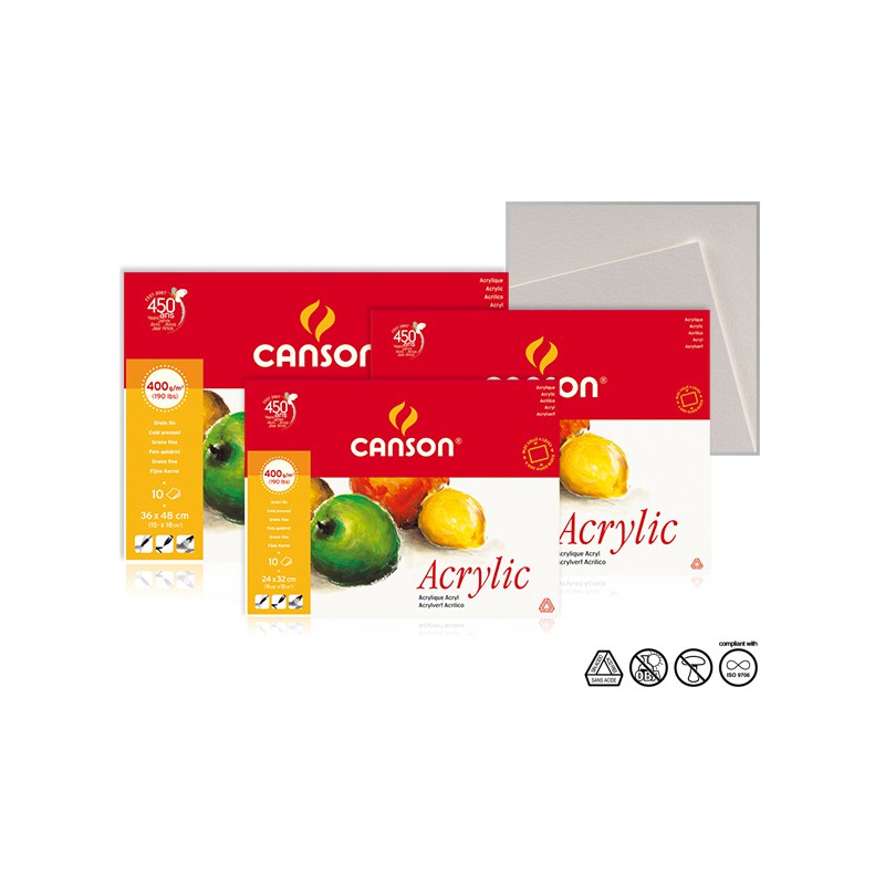 Coraz bardziej ceniona przez artystów technika akrylowa, wymaga papieru o wysokiej gramaturze, odpornego i chłonnego. Papiery Canson Acrylic zaklejone są w masie i powierzchni, co przekłada się na odporność i chłonność. Doskonale nadaje się do malowania farbami rozwodnionymi, jak i w naturalnej konsystencji, z użyciem wielu warstw. Jego drobnoziarnista powierzchnia nadaje się szczególnie do lawowania, czym przywodzi na myśl delikatność i przezroczystość akwareli. Canson Acrylic do papier bezkwasowy, o naturalnej bieli, bez dodatków wybielaczy optycznych, zgodny ze standardem ISO 9706. Polecany studentom i półprofesjonalistom.