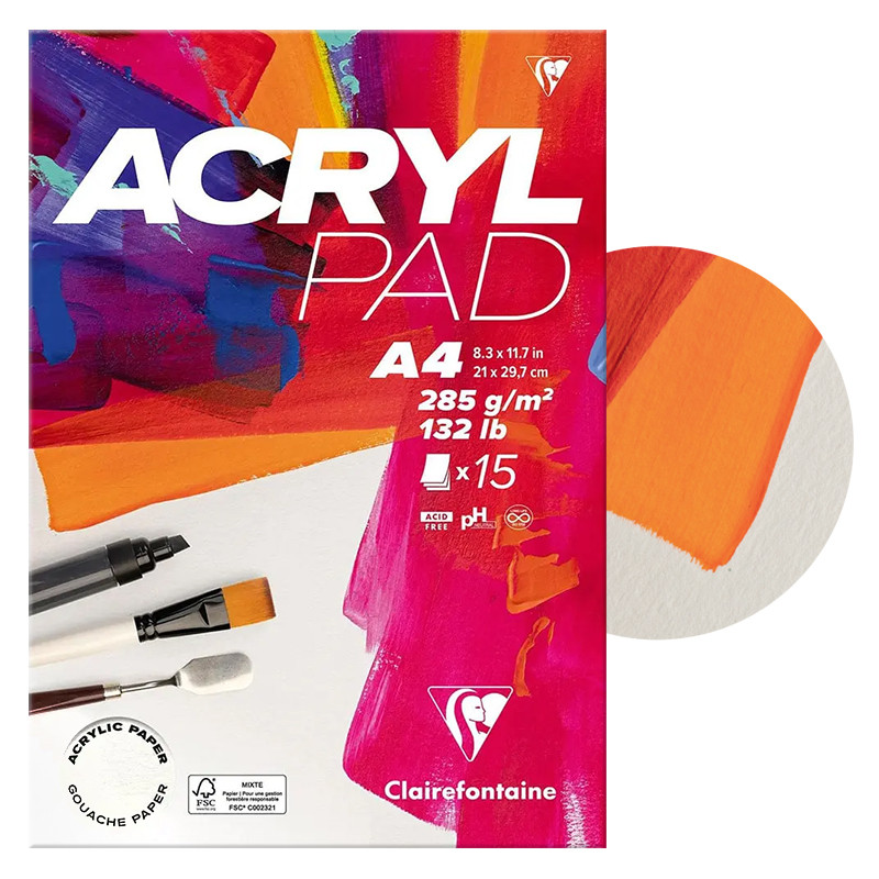 ACRYL PAD Clairefontaine to wysokiej jakości papier stworzony specjalnie do malowania farbami akrylowymi oraz gwaszem. Dzięki gramaturze 285 g/m² papier jest odpowiednio sztywny i wytrzymały, co pozwala komfortowo pracować nawet z większą ilością farby, bez falowania powierzchni.