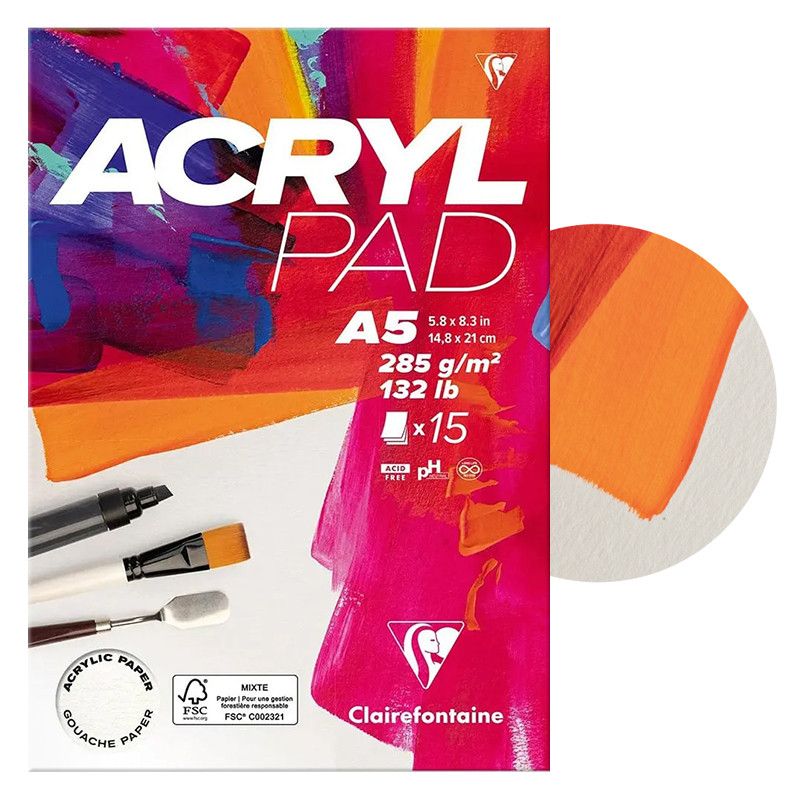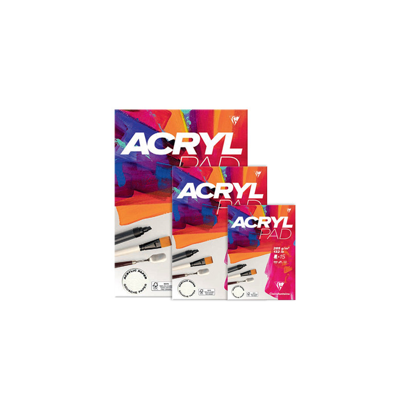 ACRYL PAD Clairefontaine to wysokiej jakości papier stworzony specjalnie do malowania farbami akrylowymi oraz gwaszem. Dzięki gramaturze 285 g/m² papier jest odpowiednio sztywny i wytrzymały, co pozwala komfortowo pracować nawet z większą ilością farby, bez falowania powierzchni.