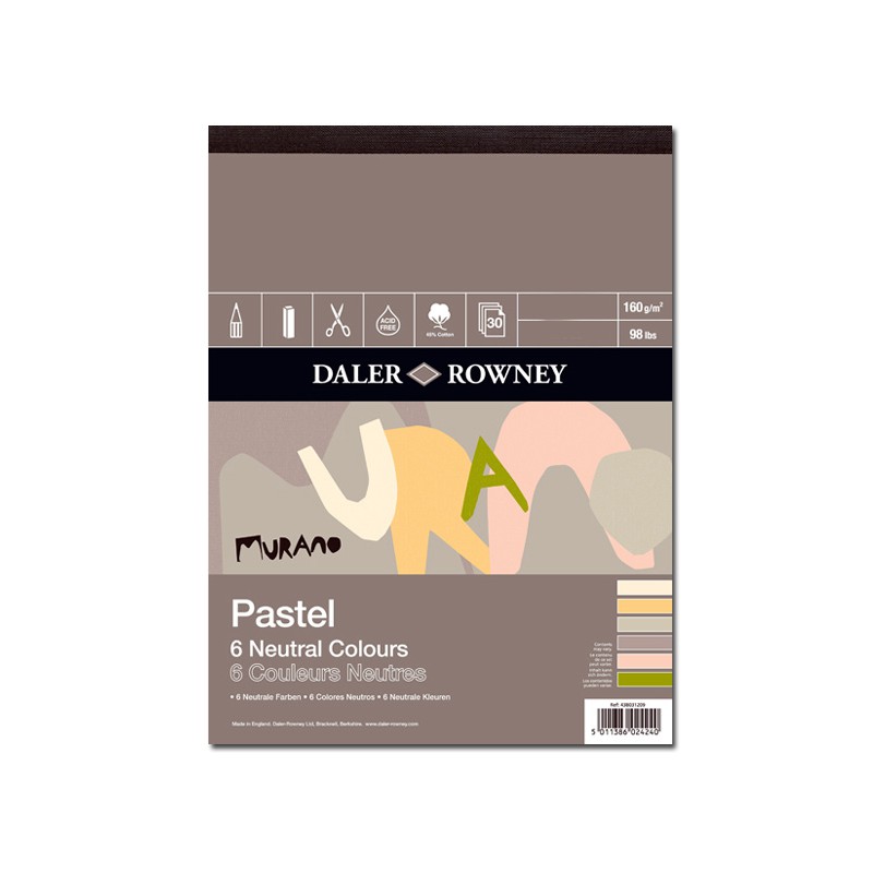 Blok do pasteli angielskiej firmy Daler Rowney z papierem Murano. Gama kolorów neutralnych. Papier Murano to wysokiej jakości produkt przeznaczony dla artystów plastyków oraz hobbystów. Głównym atutem Murano jest fakt, iż zawiera on 45% z bawełny, dzięki czemu nie żółknie zachowując swoją naturalna barwę. Papier jest bezkwasowy, posiada ładną fakturę umożliwiając pracę suchą pastelą. Rozmiar 30,5cm x 22,8cm, zawiera 30 kartek papieru o gramaturze 160g g/m2.
