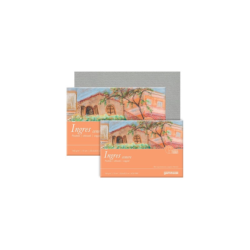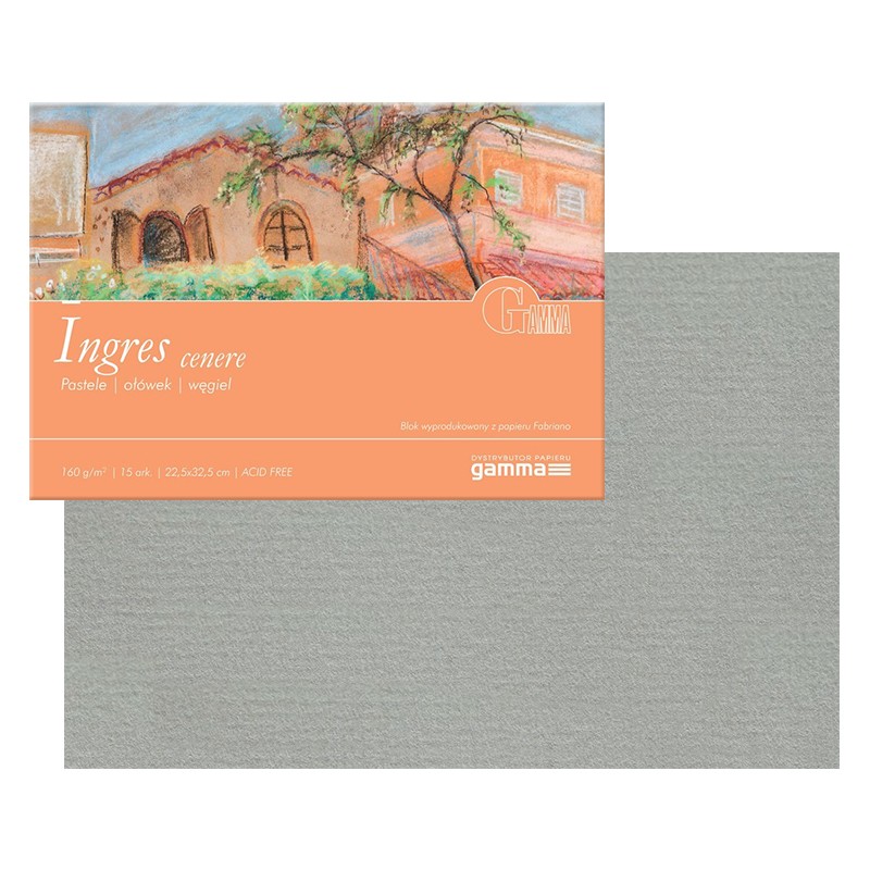Blok do pasteli Gamma Ingres z papierem marki Fabriano. Wysokiej jakości arkusze papieru ze specyficzną, prążkowaną fakturą. Seria bloków Ingres to wspaniałe podłoże dla suchych pasteli - dzięki swej strukturze zatrzymują dużą ilość pigmentu a gramatura równa 160 g/m2 zapewnia komfort pracy. Papier tłoczony – linie tłoczeń krzyżują się z liniami włókien pod kątem prostym. Arkusze w blokach są bezkwasowe i posiadają wysoką odporność na światło. Z powodzeniem może być wykorzystany także do kolażu, ołówka, węgla i temper.