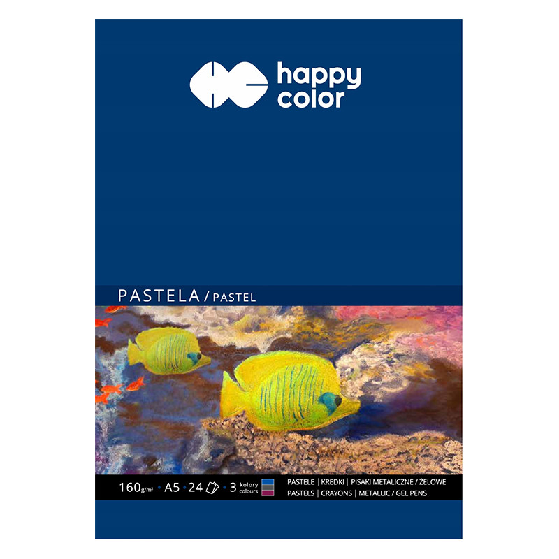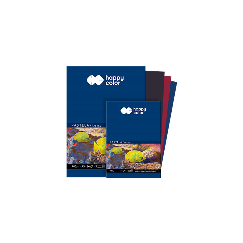 Blok z kolorowymi kartkami do pasteli marki Happy Color w formacie A5. 24 arkusze ziarnistego papieru barwionego w masie, gramatura 160 g/m². Więcej szczegółów