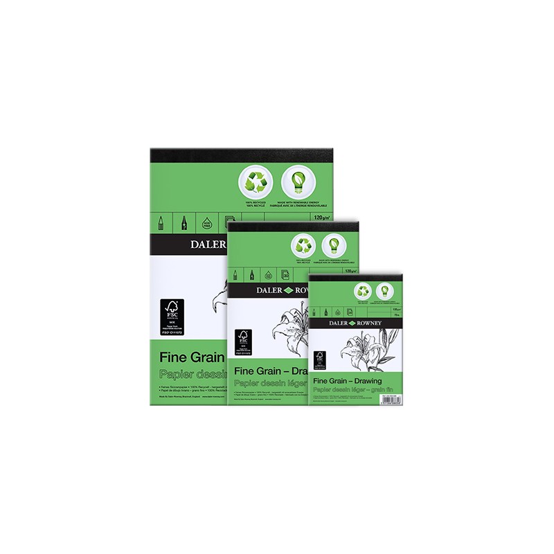 ECO Fine Grain to seria szkicowników w służbie natury i rozwoju klasyki rysunku. Obejmuje ekologiczne bloki rysunkowe (szkicowniki) w wielu formatach i dwóch gramaturach lekko ziarnistego, idealnie białego, bezkwasowego papieru firmy Daler-Rowney. Co jest sekretem angielskiego surowca? Dokładnie 100% ilość surowców pochodzących z recyklingu, przekuta w wysokiej jakości podłoże dla rysowników, projektantów i domorosłych artystów. "Lżejsza" wersja o gramaturze 120 g/m² polecana jest szczególnie do rysunków kredkami i ołówkami. "Waga ciężka", gramatura 200 g/m², odznacza się większymi własnościami wchłaniania, dlatego warto ją wybrać, gdy posługiwać się będziesz mokrymi tuszami, węglami, lub akwarelami. Znaczna sztywność papieru podniesie trwałość i zapobiegnie jego deformacji. Bloki Fine Grain 120 g/m² dostępne są w formatach A2(42 x 59,4cm), A3(29,7 x 42cm) i A4(21 x 29,7cm), zaś Fine Grain 200 g/m² w A2, A3, A4 i A5(14,8 x 21cm).