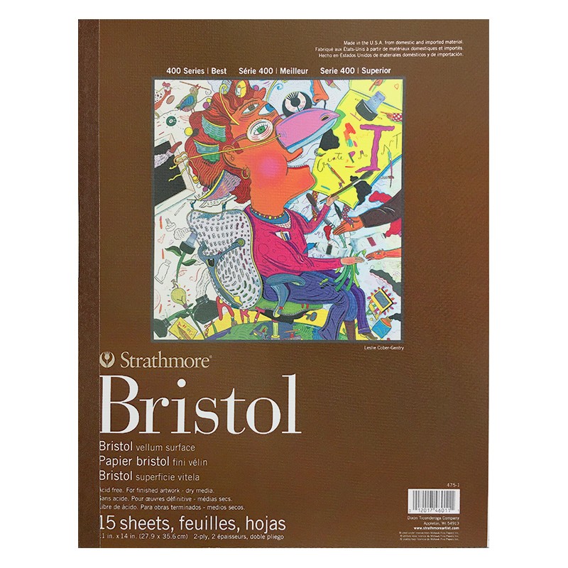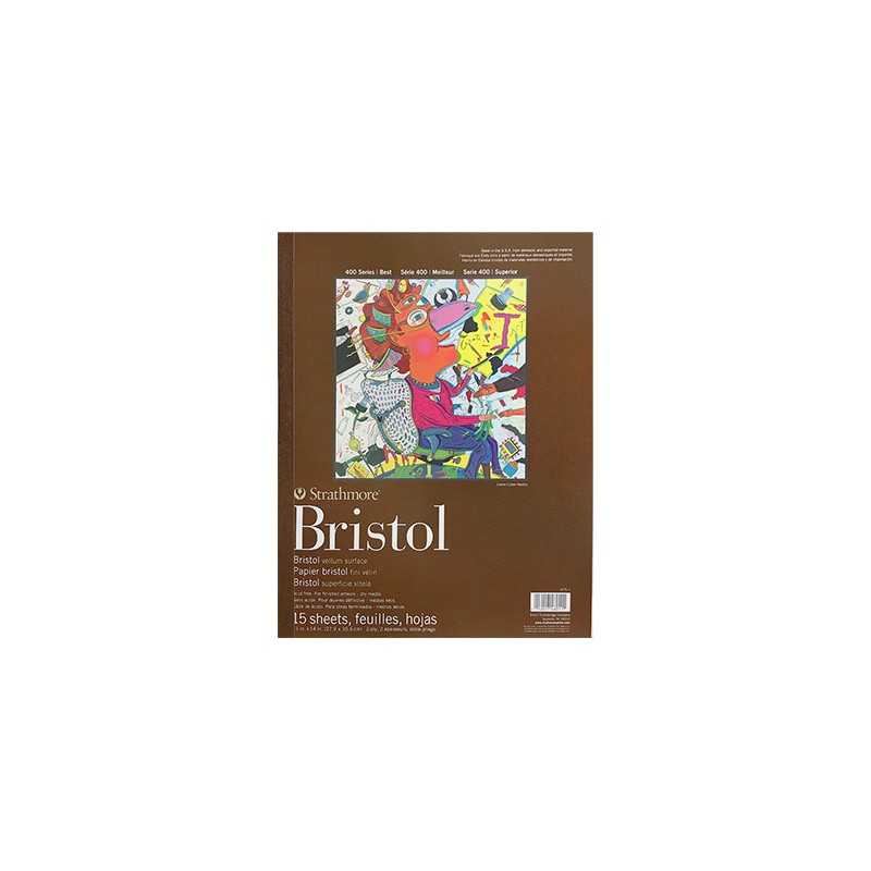 Blok z drobnoziarnistym papierem marki Strathmore Series 400. W bloku znajduje się 15 dwuwarstwowych arkuszy w kolorze białym, wykonanych z bezkwasowego papieru. Blok klejony na dłuższym boku, świetnie sprawdzi się zarówno jak i w plenerze dzięki sztywnej tylnej okładce wykonanej z grubej tektury. Bristol jest wyjątkowo wytrzymały (gramatura ok. 250 g/m), stworzony z myślą o rysunku węglem, ołówkiem i pastelami. Papier może być stosowany także pod lekkie kolaże i mokre media typu tusze czy Ecoline.