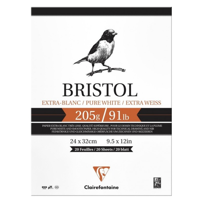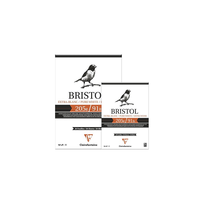 Bristol - szkicownik francuskiej firmy Clairefontaine. Extra biały, bezkwasowy papier wykonany z czystej celulozy. Blok w rozmiarze 24 x 32 cm, zawiera 20 kartek papieru o gramaturze 205g., o bardzo gładkiej powierzchni. Polecany do rysunków technicznych wykonywanych ołówkiem jak cienkopisami a także do piórek z tuszem. Pozwala na wprowadzanie poprawek poprzez skrobanie czy wymazywanie nie tracąc przy tym na jakości.