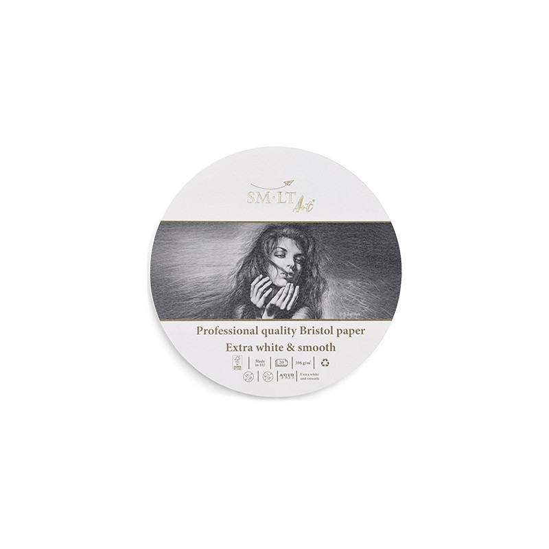 Professional Bristol marki SMLT, 20 okrągłych arkuszy gładkiego papieru o gramaturze 308 g/m². Papier bezkwasowy, gładki w kolorze extra białym. Więcej szczegółów